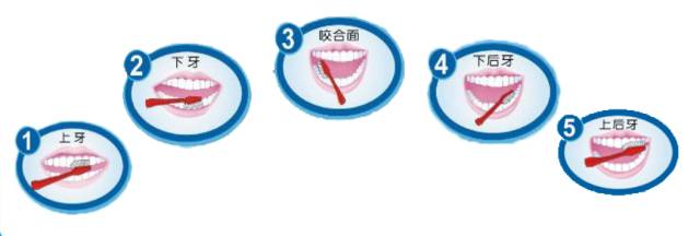 ☆ 進食后或睡覺前,用軟毛牙刷按下圖的順序輕柔刷牙,動作一定要慢而緩,只要沿著牙縫將殘留食物和牙垢刷去即可。