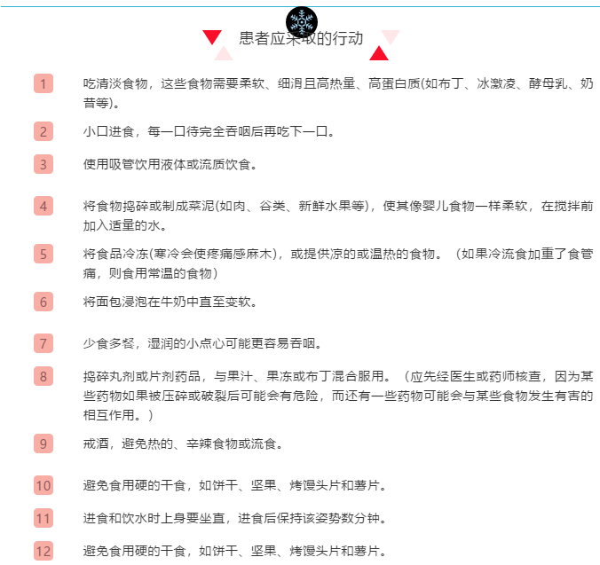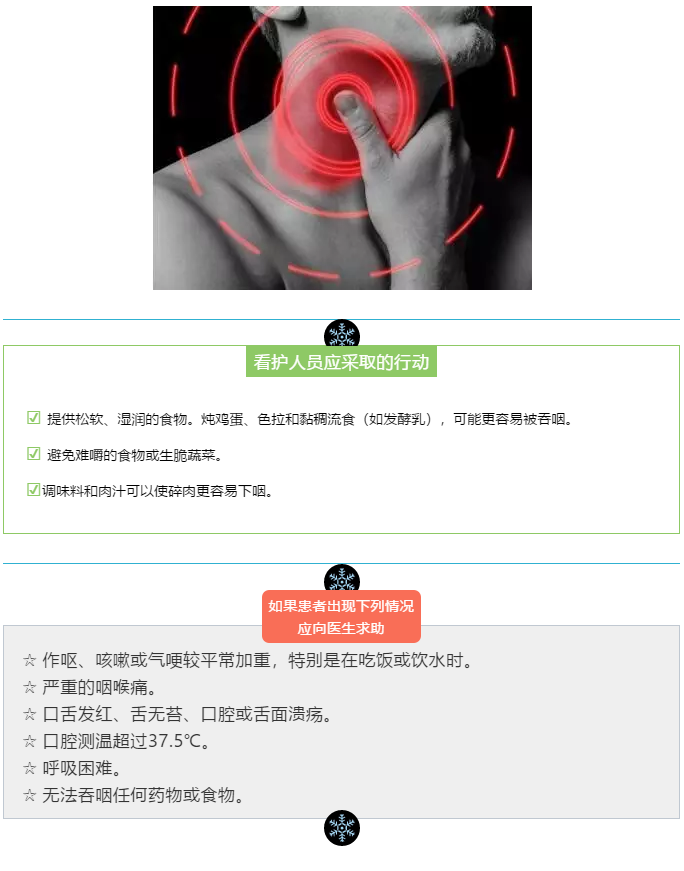 吞咽困難是指患者無法將食物或水通過咽喉下送。當(dāng)努力吞咽時,患者可能會出現(xiàn)嘔吐、咳嗽、流涎或明顯疼痛感。導(dǎo)致吞咽困難的病因有多種,除針對咽喉或胸部放療和化療所產(chǎn)生的短期不良反應(yīng)外,口腔感染(如鵝口瘡)或食道感染也是常見病因。